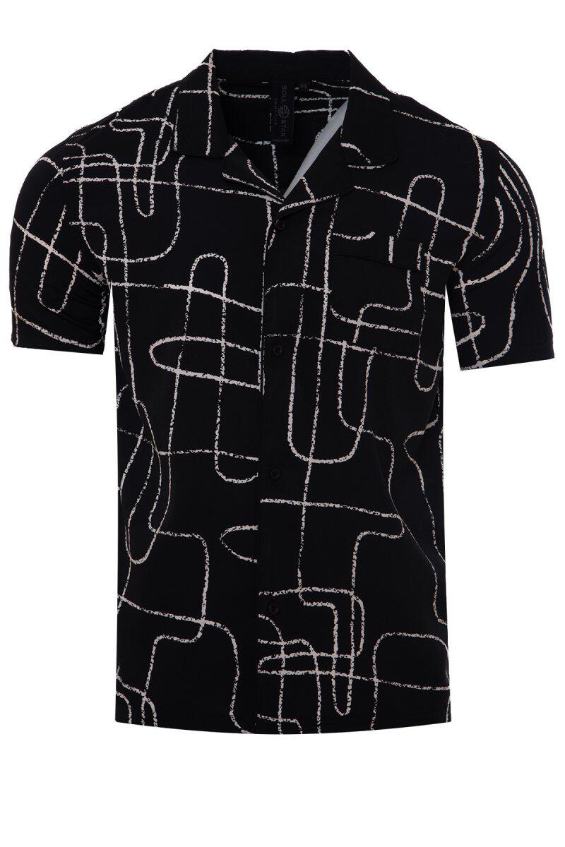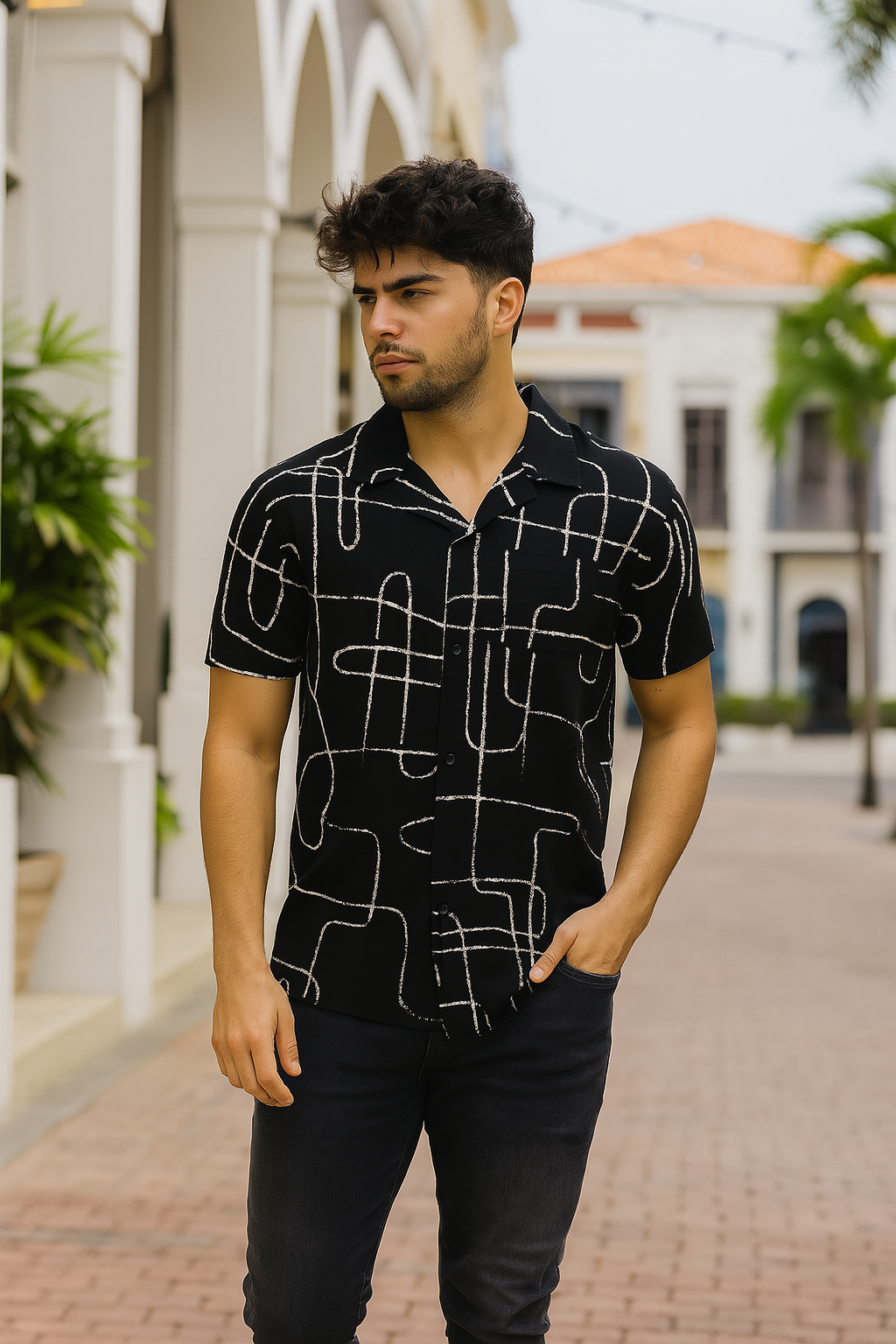 Make a statement with this modern short sleeve shirt featuring a striking abstract line print on a sleek black base. Crafted from lightweight, breathable fabric, this shirt is designed for both comfort and style. Its slim fit silhouette and soft collar add a refined touch, perfect for casual outings or elevated streetwear looks.
